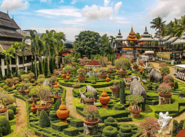 Spread over hundreds of acres, Nong Nooch Tropical Garden combines landscaped gardens, themed zones (French, Stonehenge, cactus, orchid gardens), dinosaur sculptures, and daily cultural shows. It’s one of Pattaya’s best full-day attractions for all ages, with on-site restaurants and viewpoints.